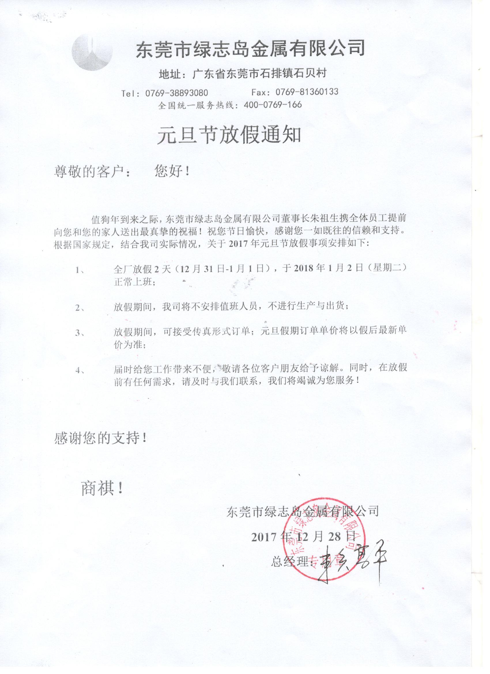 2018年元旦放假通知-綠志島-領先綠色科技